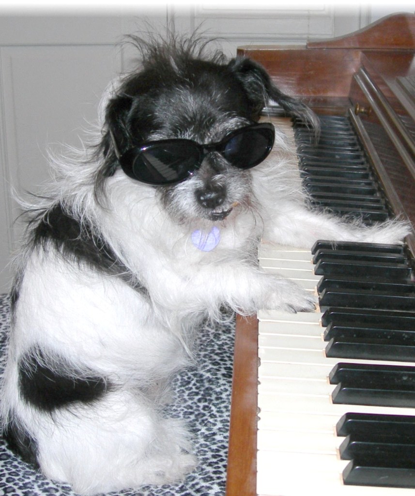 Why Blind Dog Concerts? When we started doing house concerts, we had a little dog named Espie. This photo is her Ray Charles imitation (!), and it became our house concert logo. Sadly she is no longer with us, but her legacy remains…